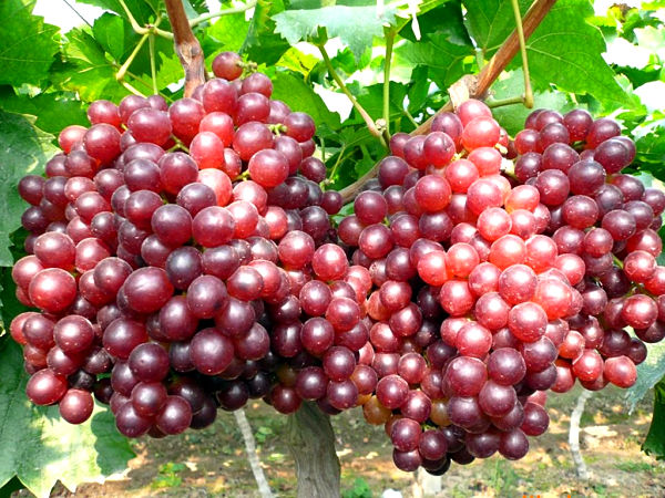 四、晚熟品種:韓國黃金香;歐美雜交種,在我地一般于8月上中旬成熟,充分成熟時果皮呈美麗的金黃色。其突出特點是:果粒特大,精細管理可比藤稔大1-2克,果粒硬度高,口感鮮甜特好,充分成熟后能在樹上掛果1個月以上,可延長到中秋、國慶銷售,價格更高。是目前可作為促成栽培和采摘園栽培的高檔新品種。