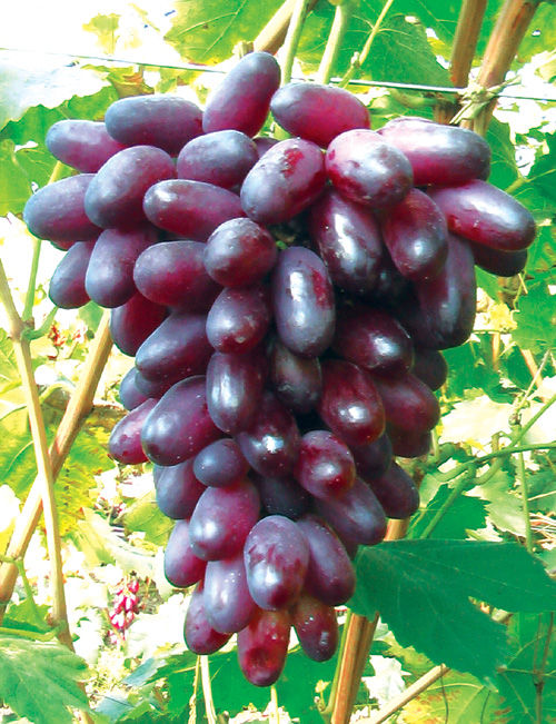 三、東方指葡萄苗:有核鮮食葡萄,果穗較大,平均重穗650克,粒重11-14克,果粒細長型,每個果粒含種子1-2粒,先端紫紅色,光亮,基部稍淡,比美人指著色好,粒長、大,外觀更漂亮,果肉爽脆,有清香味,味甜爽口,果粒頂部含糖量最高可達23度,果粒基部含糖量可達19度。抗病、豐產、易種、極早熟。在陜西地區七月下旬成熟。