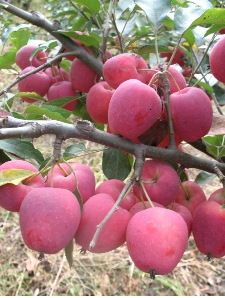 、秦冠蘋果:陜西省果樹研究所原蕪洲等育成,親本金冠×雞冠。1957年雜交,1966年入選,1970年命名。曾參加大蘋果區域試驗,1988年獲國家發明獎二等獎。在我國分布較廣泛,西北地區栽培較多。果產圓錐形,單果重約200-250克;底色黃綠,陽面有暗紅暈及斷續紅條紋,常帶有白色銹,在西北海拔較高的地區充分成熟時,可以達到全面暗紅色,在海拔低的平原地區則難以著色;果面光滑、蠟質較多,果點明顯,果皮較厚韌;果肉乳白色,肉質脆、稍致密,汁液較多,風味酸甜,含可溶性固形物11%-16%(不同地區差異較大),初采時鮮食品質中上。生長勢強,樹姿開張。開始結果早,苗木栽后2-3年即結果。初結果以長果枝和腋花芽為主要結果部位,盛果期后以短果枝和腋花芽結果為主,坐果率高,有較強的自花授粉能力,早果性、豐產性突出。在西北地區以及華北北部、遼寧西部于10月中旬成熟。果實很耐貯藏,一般半地下式土窖中可貯至次年5月。